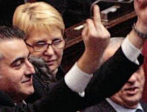 Ieri ha accolto il risultato del voto a tutela del presidente Berlusconi esibendo trionfante il dito medio di entrambe le mani, come insulto plastico e non rispettoso alla controparte politica e soprattutto al luogo che ha l'onore di frequentare.